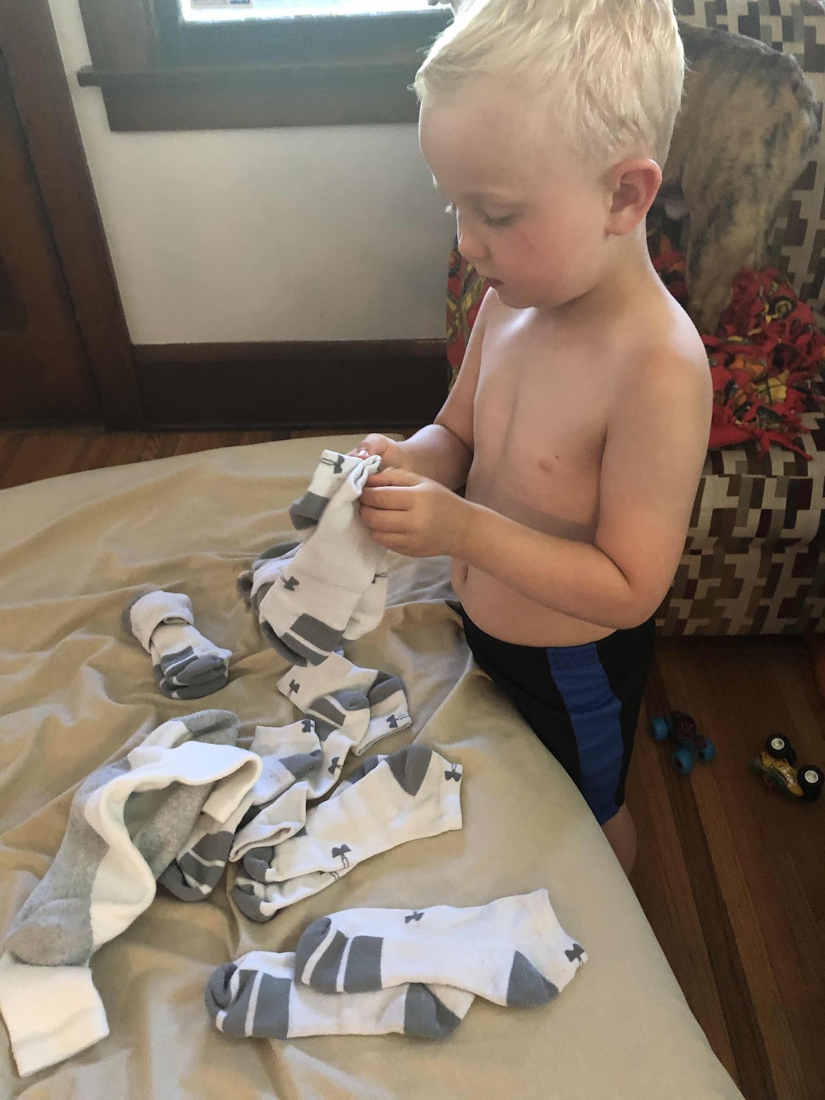 Xander has a chore chart and he’s been doing things around the house to earn stickers and once he fills the chart, he gets a toy. He has 8 boxes left, and so he’s VERY motivated. Today as I was folding laundry, he rushed over and said, “I’ll help!” and so he learned how to flip pairs of socks together today.