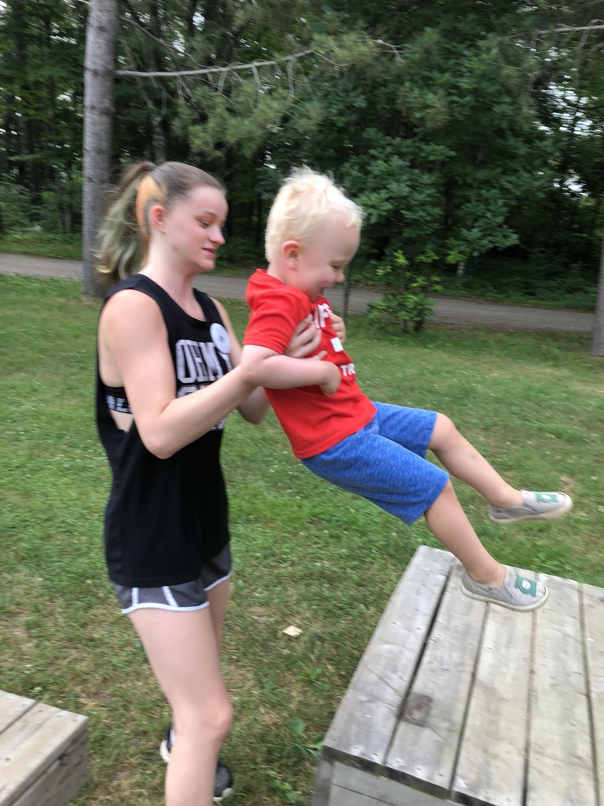 It’s ninja warrior week at camp! The course was set up for the big kids, but my kids were the first ones to test out some of the pieces. I think Katie might have gotten the best workout, because she was amazing at lifting and carrying little boys through the parts they couldn’t do!